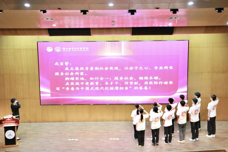 仪式最后,全体实践团队员起立宣誓,伴随着“服务社会”“践行担当”的激昂誓词,浙江越秀外国语学院2025年大学生暑期社会实践的出征号角正式吹响,越秀青年将以实际行动践行青春誓言,踏上暑期社会实践的征程。